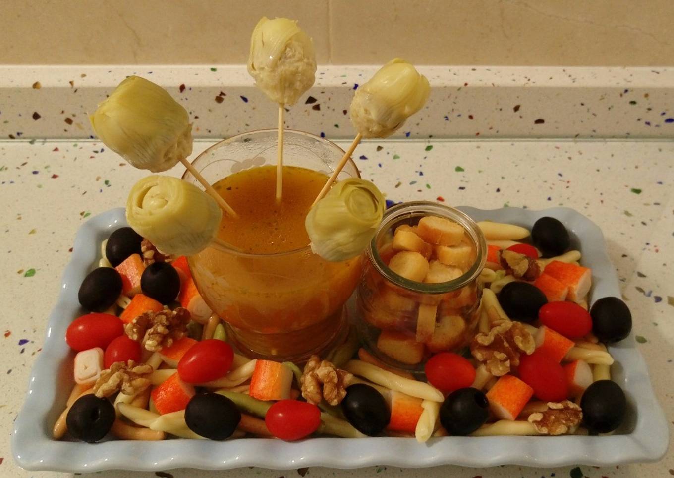 - En cada plato colocamos un vaso con la crema de calabaza y colocamos varios palillos con alcachofas dentro, un botecito con los picatostes, alrededor echamos la pasta y vamos echando los palitos de mar, las aceitunas negras, los mini tomatitos y las nueces y lista nuestra ensalada con crema de calabaza.