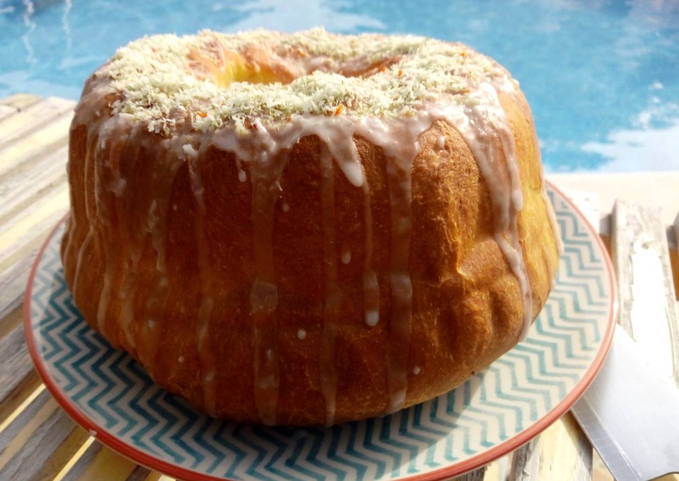 Este pastel suele decorarse con azúcar de los colores típicos que son el verde (esperanza), el amarillo (poder) y el púrpura (justicia). En mi caso, usé coco rallado y un poco de ralladura de limón. El glaseado es sencillamente azúcar glass y agua.