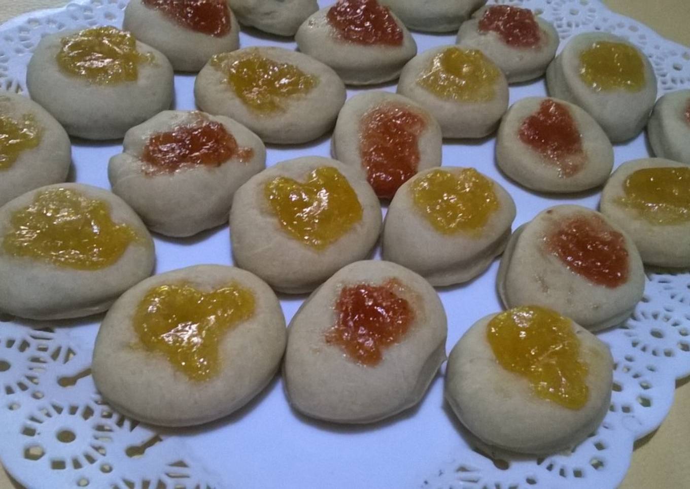 - Cortamos y llevamos a placa enmargarinada, presionando con el pulgar cada galletita para formar un huequito. Esparcimos un poco de dulce en la misma.