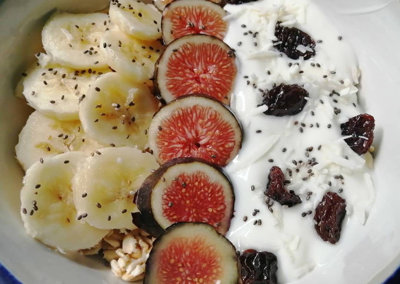 - En un recipiente como base agregar unas 4 cdas de yogurt y posteriormente la avena. Pica la fruta y acomoda como mejor te guste, agrega nuevamente yogurt. Al último agrega chía, coco rallado, pasas y miel. Listo a disfrutar.