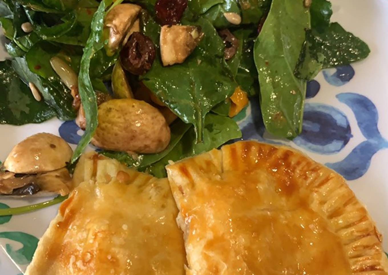 - Colocar todos los ingredientes. Preparas tu vinagreta y bañas tus espinacas con ella, yo acompañe mi ensalada con las “Empanadas de pechuga de pavo con queso que les compartí en las recetas anteriores”
