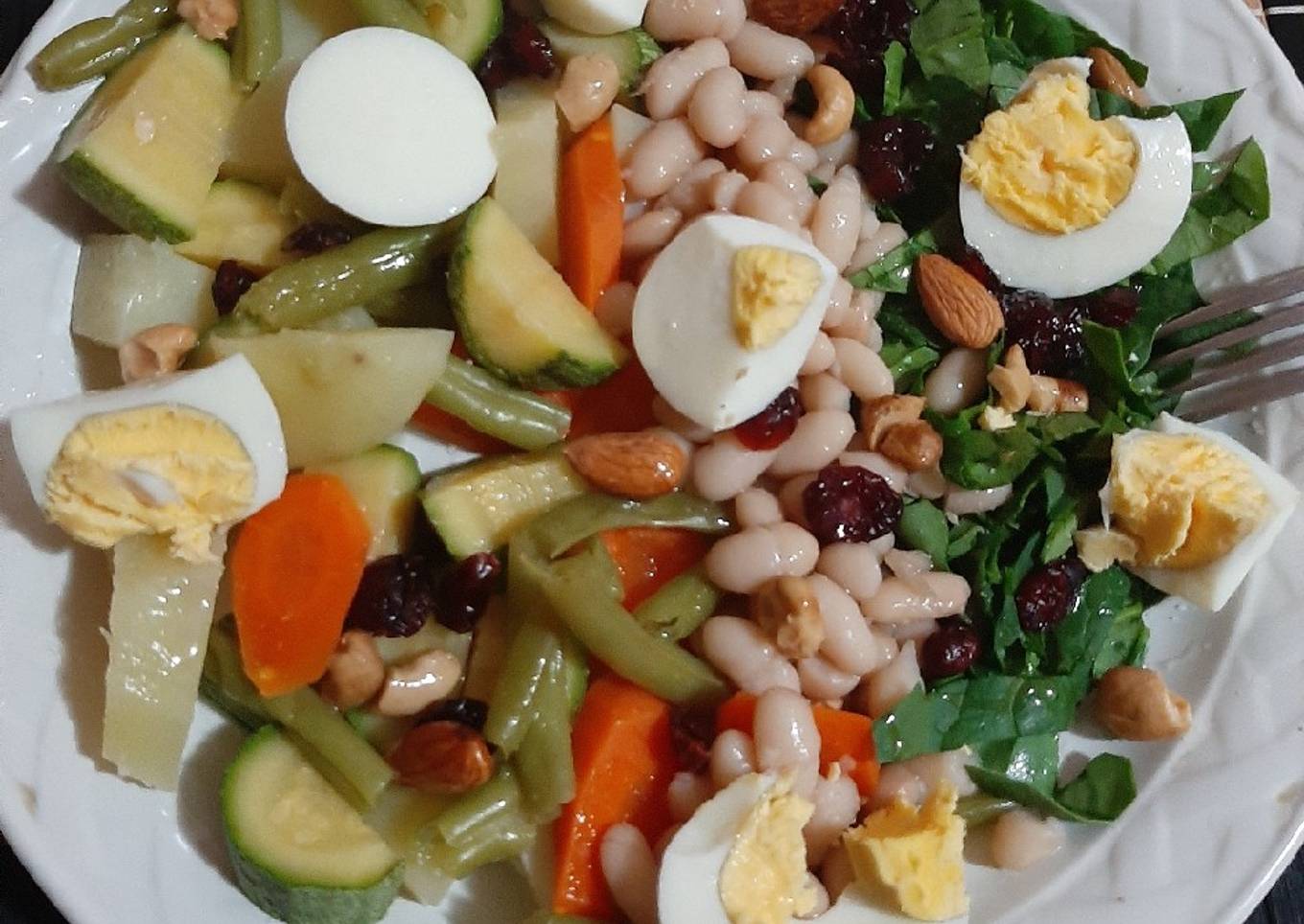 - Cocemos toda la verudra y huevo. (Espinaca va cruda) Pica y revuelve todo agrega frijol frutos secos, un chorrito de aceite de oliva, sal, limĂłn y listo. Te llena porque te llena.