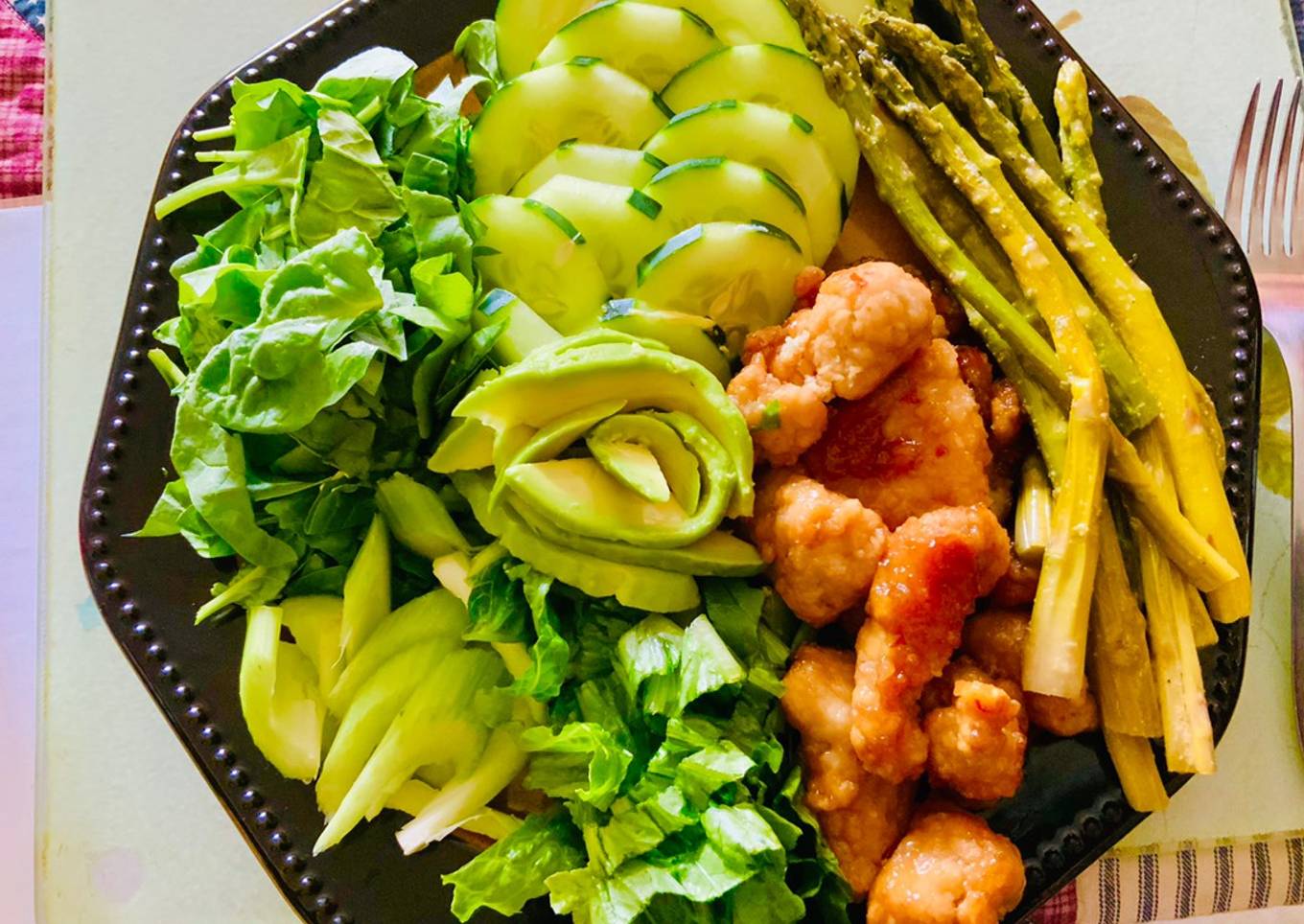 - Picas o troceas la lechuga y espinacas, la acomodas en un Platón, el pepino lo medio pelas, y rebanas, las rebanadas las acomodas de la manera que lusca más. El apio lo picas también y acomodas por un ladito. Acomodas tu pollo, y espárragos. Lo puedes decorar a tu gusto, yo sólo tenía un poco de aguacate, y me lo quise terminar, no puse tomate, porque el pepino es fruta, y será suficiente, pones tu aderezo favorito y listo!!!