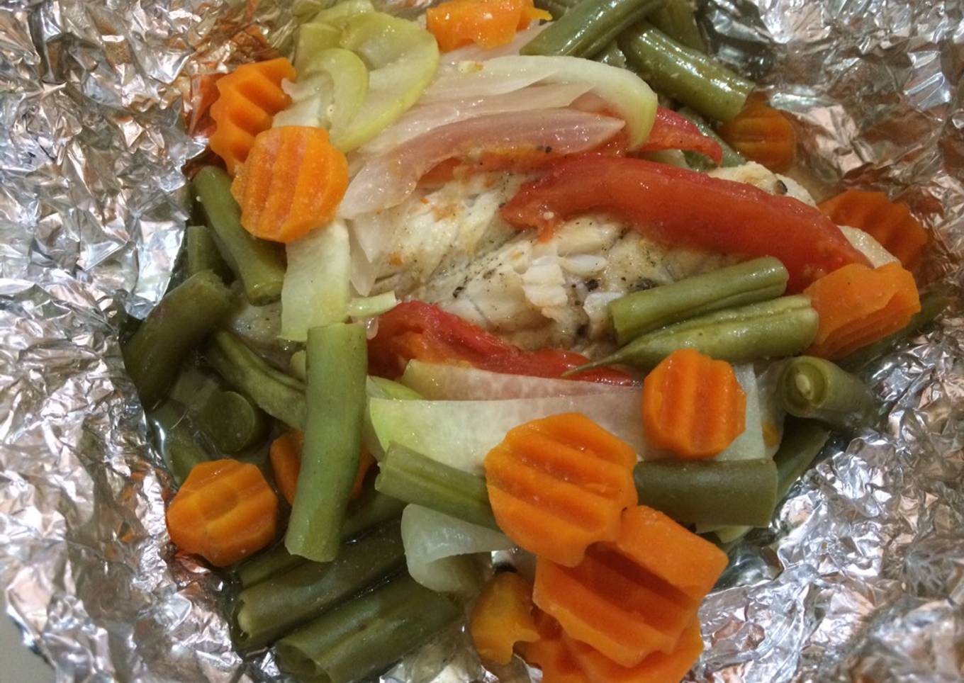 - En un cuadro de papel aluminio colocamos 3 piezas del pescado, le agregamos orégano y ajo en polvo, y las verduras (cebolla, tomate, chayote, ejotes y zanahoria) agregamos el chile jalapeño para los adultos, cerramos el papel, igual con el resto del los ingrdientes