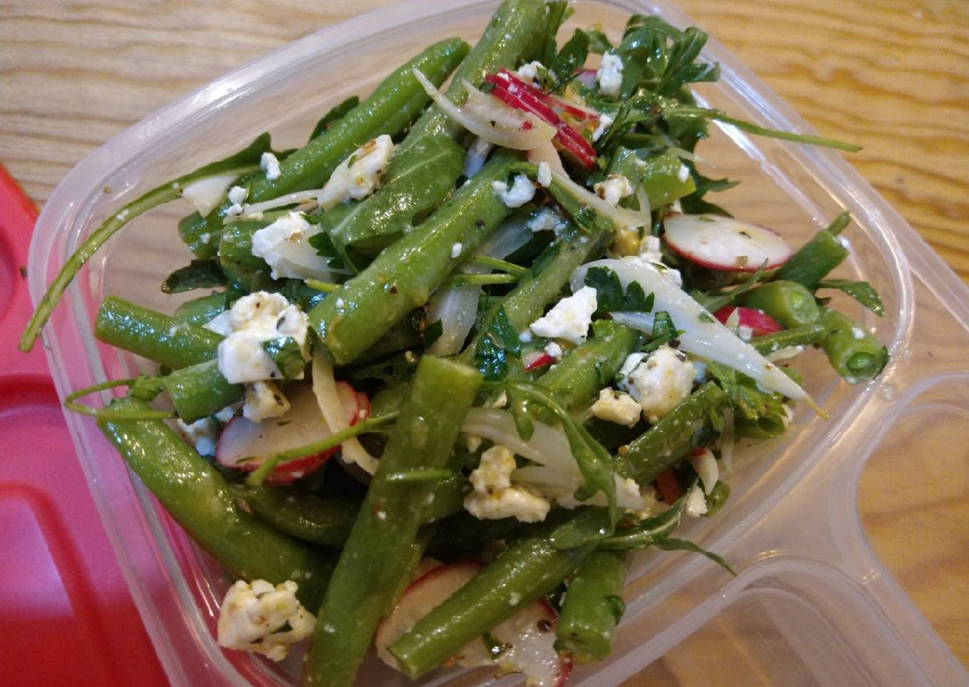 - En un bowl mezclar ejotes, rábano, perejil, orégano, cebolla, queso cottage y arúgula e incorporar la vinagreta a último momento.