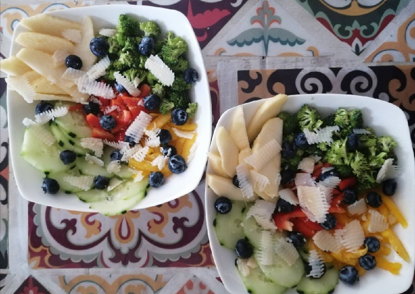 - Acomodamos directo en 2 tazones individuales y por 煤ltimo agregamos los blueberries y tiritas del queso parmesano. Se puede acompa帽ar con aderezo de mostaza, bals谩mico, de lim贸n, o comer as铆 sin aderezo.