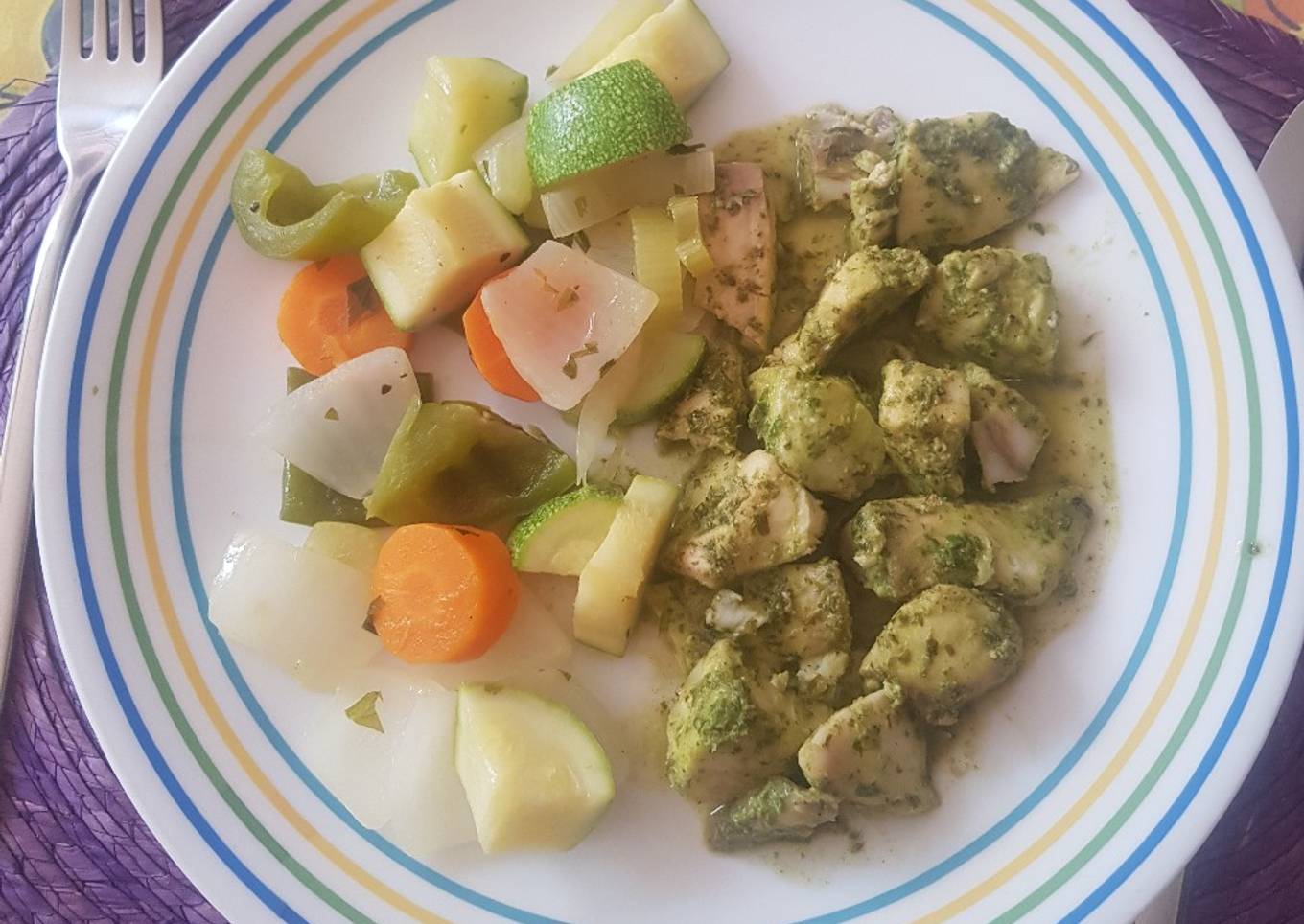 - Calentar un sartén amplio y vaciar los cubos junto con la salsa. Tapar y dejar cocer, está listo en 5-6 minutos. Servir con la guarnición de tu preferencia, yo preparé verduras a la mantequilla, que también encuentras en mi recetario.